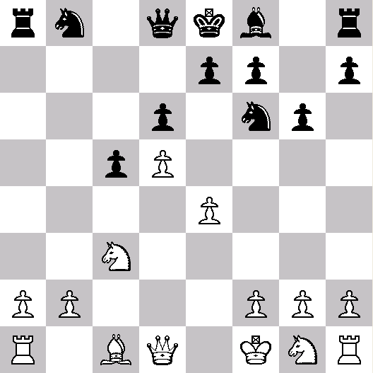 5..., a:b5 6. e4, Va5+ 7. Fd2 ( zavart okozhat 7. b4) 7..., b4 8. Ha3, d6 9. Hc4, Vd8 10.a3, e6